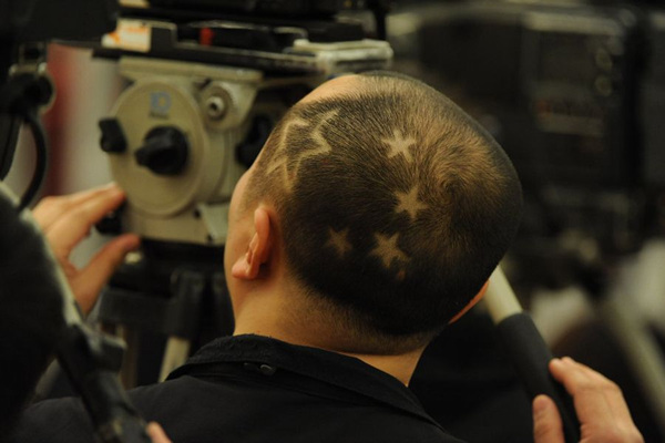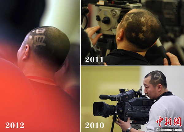 2011年3月6日下午14时,十一届全国人大四次会议在人民大会堂三楼金色大厅举行记者会。该名记者理了五星红旗的发型。